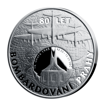 Pamětní ražba z ryzího stříbra byla vydaná k připomenutí 80. výročí tragického leteckého útoku na Prahu 14. února 1945. Na averzu ražby na první pohled zaujmou americké bombardéry B-17. Pod nimi z ptačí perspektivy vidíme pražské ulice a domy spolu s typickou křivkou řeky Vltavy. V popředí je na lesklé kruhové ploše zpodobněn Emauzský klášter, jehož obě pseudogotické věže byly náletem zcela zničeny. Klášter je na medaili znázorněn již s věžemi novými, které v roce 1968 nahradily provizorní zastřešení. Betonové skořepiny se zlatými špičkami podle návrhu významného českého architekta Františka M. Černého jsou dnes již ikonickou dominantou a mementem obětí tragického bombardování. Opis v kruhu uvádí přesný čas trvání náletu tak, jak bylo uvedeno v hlášení obou bombardovacích skupin.