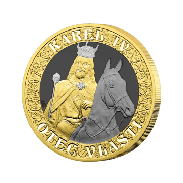 Designu pamětní ražby vydané k 675. výročí nástupu Karla IV. na český trůn dominuje mimořádné zpodobnění Karla IV. jako českého krále jedoucího na koni. Okruží tvarované bezpočtem nádherných listů národního stromu doplňují nápisy KAREL IV. a OTEC VLASTI.