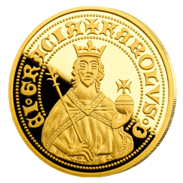 Averz mince je věrným zpodobněním původního královského dukátu Karla IV. Zdobí ho polopostava panovníka v majestátu s královskými insigniemi. Na hlavě má královskou korunu s liliemi, v pravé ruce drží žezlo, v levici pak třímá královské jablko s výrazným křížkem. Král má delší vlasy a v jeho tváři je vidět snaha umělce o zachycení individuálních, portrétních rysů mladého panovníka. Velice výrazný je i plášť sepnutý na hrudi velkou sponou.