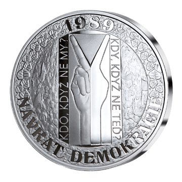 Unikátní pamětní ražba z ryzího stříbra připomínající sametovou revoluci a návrat demokracie v roce 1989. Averzu ražby dominuje dlaň se známým symbolem „V“, který znamená „VÍTĚZSTVÍ“. Nad prsty je v okruží z lipových lístků uveden rok 1989 a na spodní části ražbu lemuje nápis NÁVRAT DEMOKRACIE.